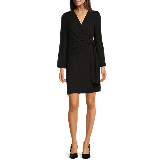 Cheapest ???? Alex Marie Petite Size Jolie Surplice V-Neck Long Sleeve Stretch Crepe Gathered Ring Waist Faux Wrap ???? Dress Black ❤️