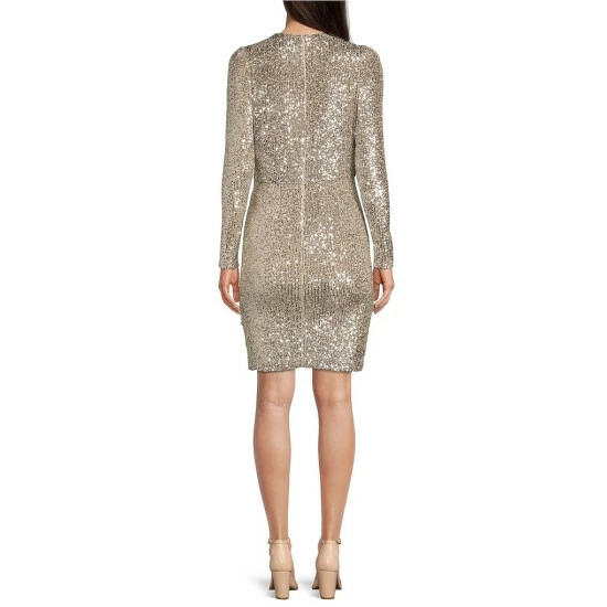 Outlet ???? Alex Marie Petite Size Milly Sequin Surplice V-Neck Long Sleeve Gathered Waist ???? Dress Silver ????