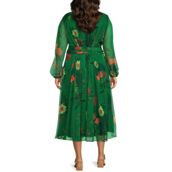 Budget ???? Alex Marie Plus Size Hayden Floral Print V-Neck Long Blouson Sleeve Pleated Tie Waist Palm Midi ???? Dress Palm Multi ????