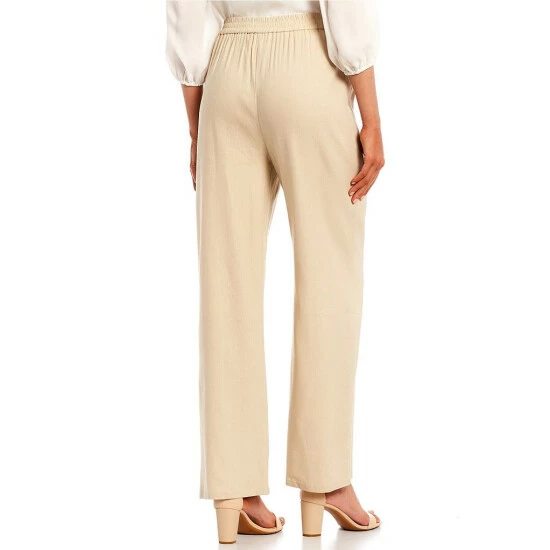New ???? Alex Marie Roselyn Straight Leg Tie Sash Waist Mid Rise Stretch Linen Pants Sandstone Tan ????